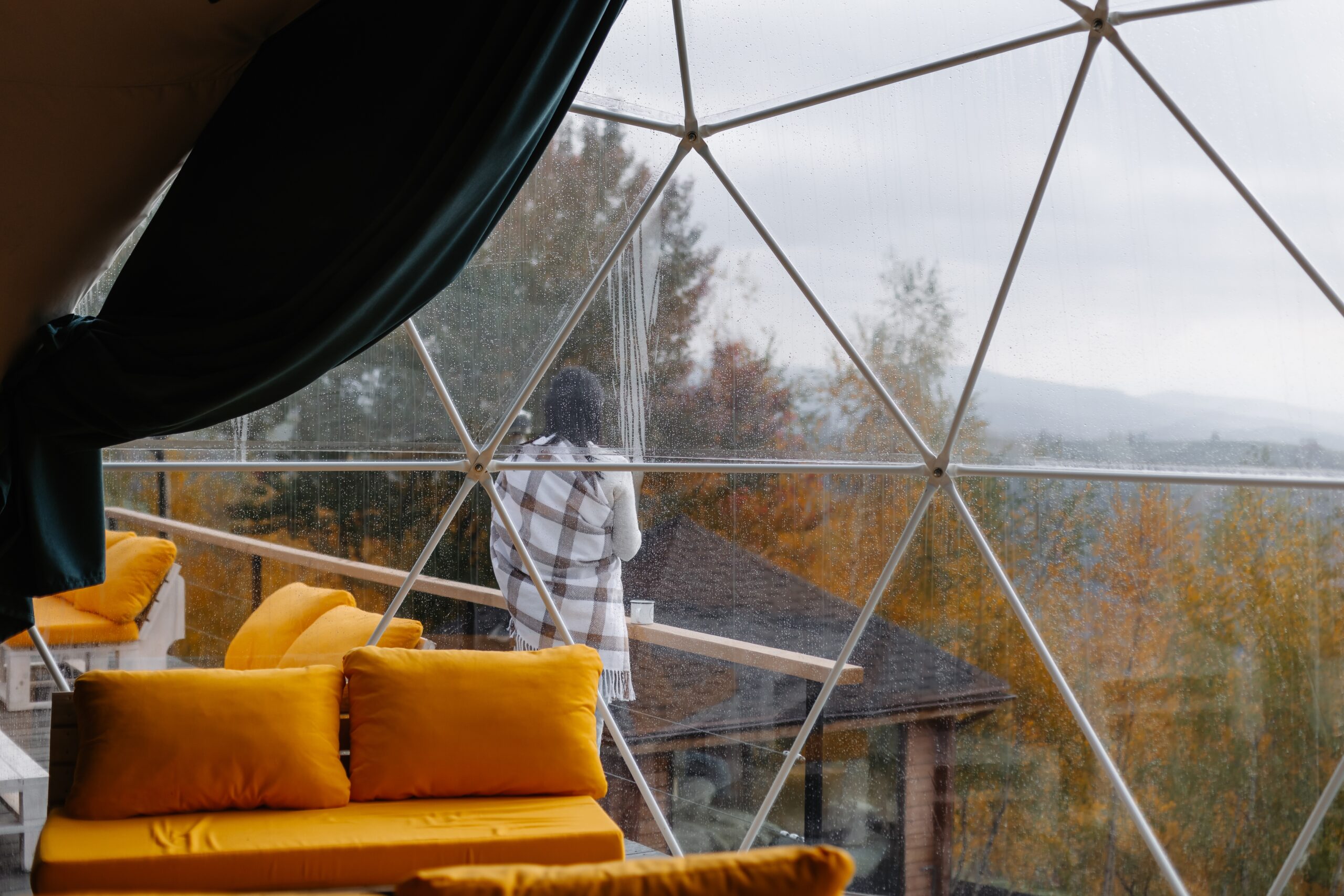 - The unique, spherical design provides an open, airy atmosphere while maintaining warmth and privacy. Large windows and a skylight offer spectacular views of the surrounding landscape, ideal for stargazing at night or enjoying scenic sunrises.